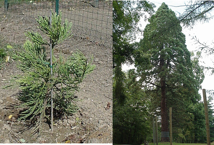 Our Sequoiadendron is the one on the left. The 'little fella' is about 18 inches tall. It is a cutting from the tree on the right which has been growing at Tyler Arboretum for almost 150 years. Check back in 25 years or so to see how it is doing.