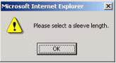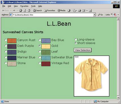 Create a page that allows a user to select whether they want to view a short-sleeve or a long-sleeve version of the Sunwashed Canvas Shirt. Also allow the user to select the color. If the user clicks the button but fails to make one of these above selections, a message should pop up. Otherwise, clicking the button should display an image of the shirt selected.