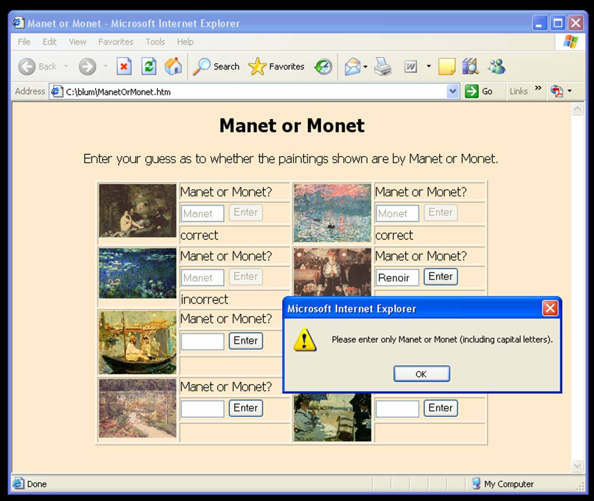 where the two vertical lines || correspond to an "OR". (Recall that testing equality uses two equal signs; it may not look like it above.) If an acceptable answer is given, disable the button and textbox; otherwise, display an alert box. Use a nested if to determine whether an acceptable answer was correct or incorrect. Display a message accordingly. Focus on the new code (the textboxes and the ifs), but remember that ideally we would prefer to have one function that handles all eight button click events. (ManetMonet.zip)