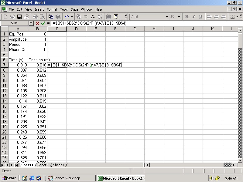 into the column next to the data (cell C7 in the example below). Note that in place of the parameters (e.g. the amplitude A) in the formula we have used its cell reference using absolute addressing (e.g. $B$2). Furthermore in place of t, we have used the cell reference A7 (no dollar signs). After the formula is entered, copy it down the column. (Excel assumes that we are working in radians which is what we want.)