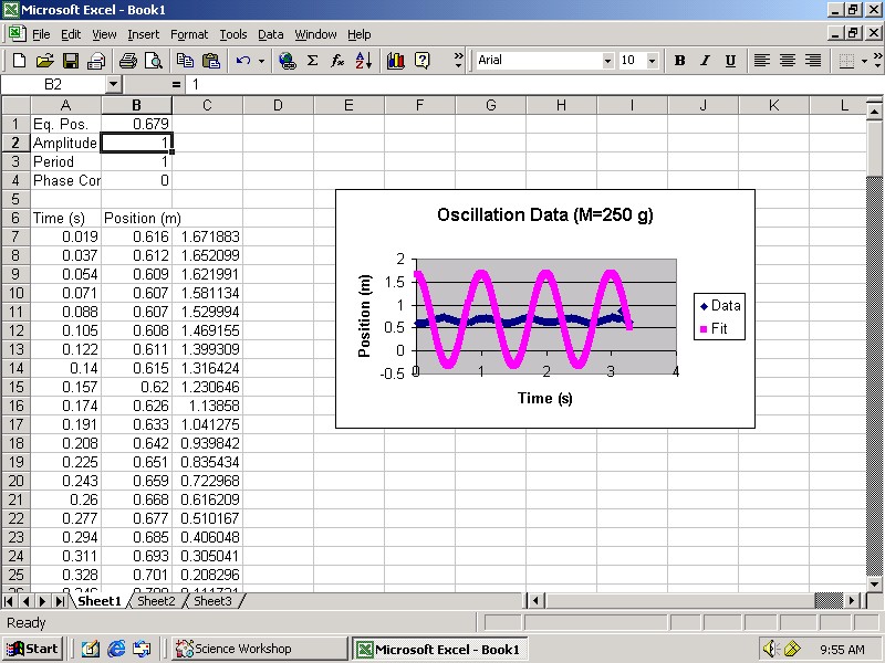 Now let us choose the parameters to fit the data better. The equilibrium position, yeq, is the midpoint of the data. One can estimate it by taking the average of a high point and a low point. After adjusting this parameter (i.e changing the value in the cell B1), the two curves should have the same (vertical) midpoint. If everything before was done correctly, the chart will be updated automatically.